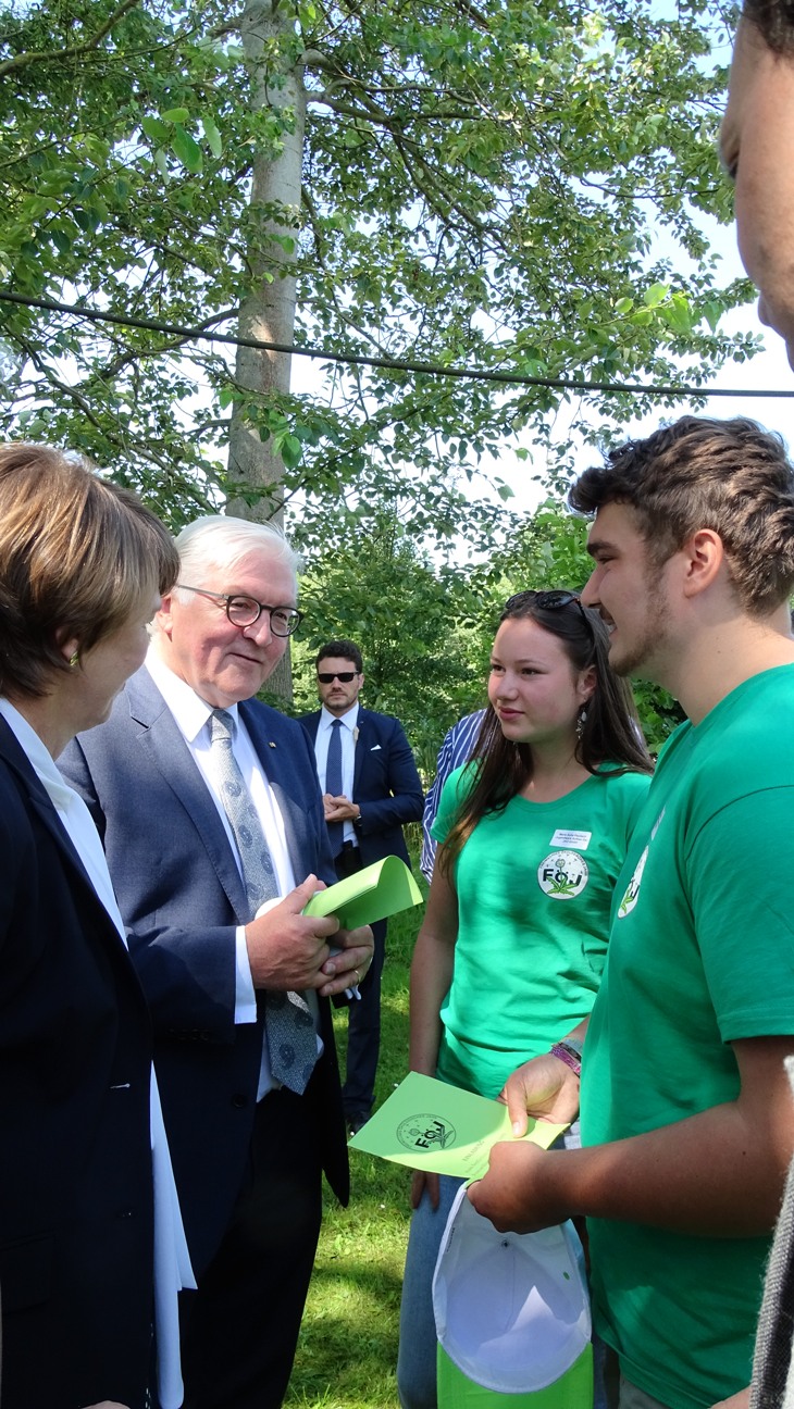 Anlässlich des Antrittsbesuches in Mecklenburg-Vorpommern im Rahmen seiner Deutschlandreise besuchte der Bundespräsident Herr Frank-Walter Steinmeier mit seiner Ehefrau Elke Büdenbender den Naturpark „Am Stettiner Haff“. Begleitet wurde der Bundespräsident von der Ministerpräsidentin Mecklenburg-Vorpommerns Manuela Schwesig sowie dem Staatssekretär Patrik Dahlemann. Bei einer Fahrt mit dem Floß auf der Randow und der Uecker präsentierte der Natur- und Landschaftsführer Detlef Ertelt dem Bundespräsidenten und seinen Begleitern sowie eingeladenen Gästen die Schönheit der Naturpark-Region. Außerdem nahm sich der Bundespräsident die Zeit, um mit den geladenen Gästen ins Gespräch zu kommen. Neben regionalen Vertretern aus Politik und Wirtschaft, waren auch Vertreter ehrenamtlicher Initiativen eingeladen. So präsentieren die Buchkinder vom Stettiner Haff ihre jüngsten Werke und die Sielmanns Natur-Ranger des Teams Löcknitz berichteten über ihren Einsatz für die Natur. Die drei anwesenden Teilnehmer des freiwilligen ökologischen Jahres nutzen die Gelegenheit, um den Bundespräsidenten und die Ministerpräsidentin auf die immer schlechter werdende Finanzausstattung dieses Bundesprogramms aufmerksam zu machen.