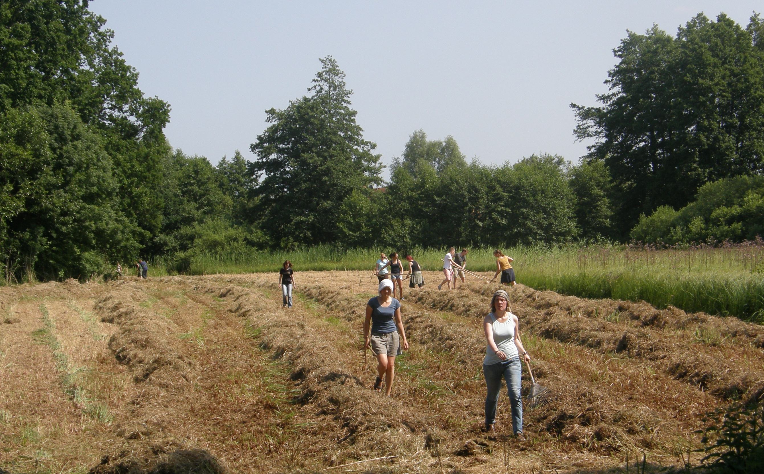 Jetzt werden sich sicher einige Fragen warum das Mahdgut „händisch“ zusammen geharkt werden muss und nicht einfach ein landwirtschaftlicher Schlepper genutzt wird. Auch hier ist die Frage recht kurz beantwortet: herkömmliche landwirtschaftliche Technik ist für die Feuchtwiesen meist viel zu schwer und kann somit nicht für die Pflege eingesetzt werden. Deshalb kommt dort speziele Mähtechnik und manuelle Unterstüzung zum Einsatz.