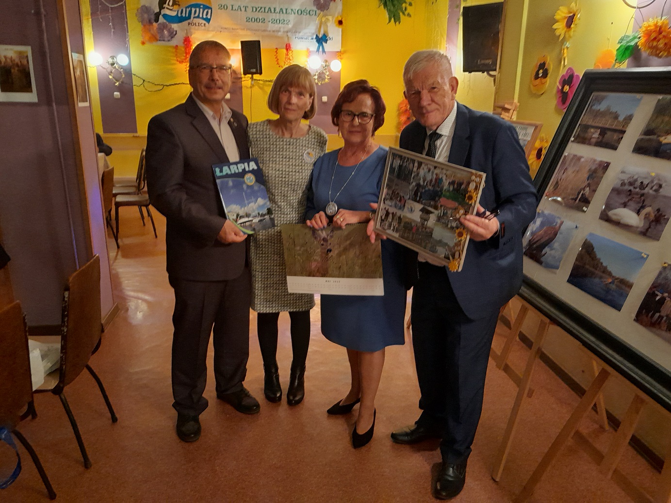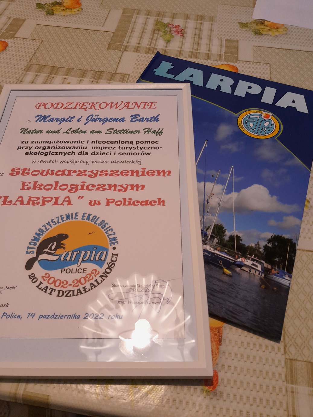 Am 14. Oktober 2022 wurde der Förderverein Naturpark Am Stettiner Haff e.V. zum 20. Jahrestag der Gründung des Ökologischen Vereins „Łarpia“ nach Police eingeladen. Łarpia ist der Name des Flusses, an dem Police liegt. Seit 2005 gibt es gemeinsame Treffen und Aktionen, wie z.B. Exkursionen zum Königsstuhl auf Rügen oder auf die Insel Wollin, Kanufahrten sowie den Bau und Aufhängen von Vogelhäusern. Gegenseitig werden Feste besucht, wie unsere Naturparkfeste oder bei den polnischen Partnern deren Frühlings- und Kartoffelfest. 1–2 mal im Jahr treffen wir uns auch bei Wanderungen. In unserer Naturparkregion organisiert der „Wanderverein Haffküste“ e.V. diese Führungen. In der Festrede vom Präsidenten des Vereins Wiesław Gawel wurden auch unsere gemeinsamen Treffen genannt. In Gesprächen erfuhren wir, dass einige Veranstaltungen sich auch im regionalen Fernsehen wiederfinden. Die nächsten Treffen sind schon verabredet, denn im kommenden Jahr wird unser Förderverein sein 20-jähriges Bestehen feiern.