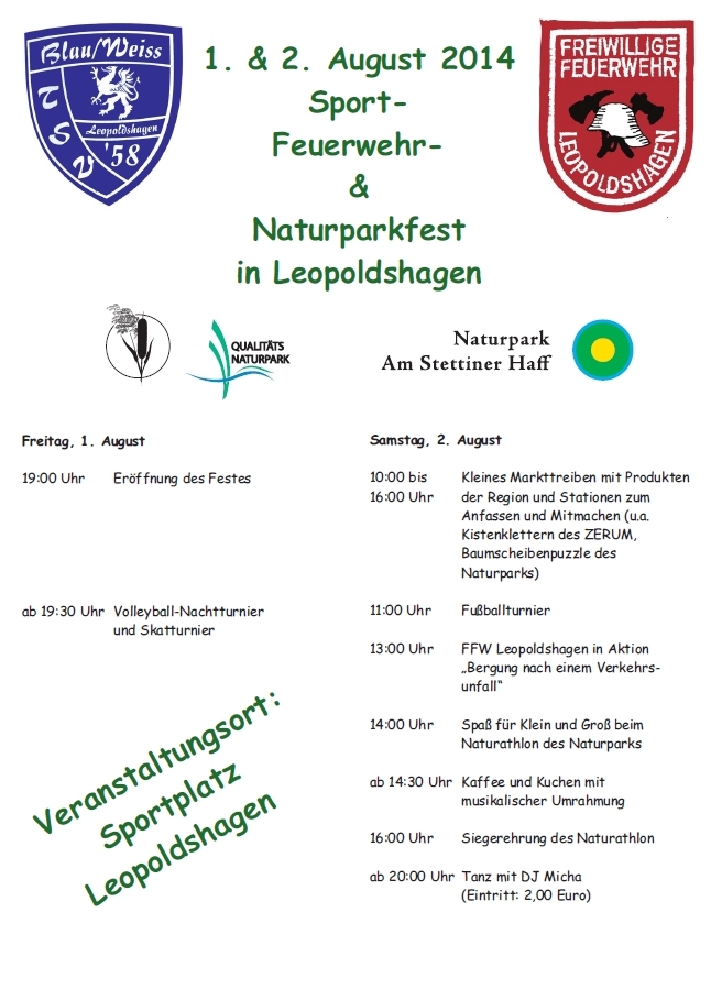 Am kommenden Wochenende wird in Leopoldshagen gefeiert. Neben dem Sportverein und der Freiwilligen Feuerwehr lädt der Naturpark Am Stettiner Haff alle herzlich ein mit zu feiern. Los geht es bereits am Freitag, dem 1. August 2014. Nach der Eröffnung geht es ab 19:30 Uhr mit dem Volleyball-Nachturnier und dem Skatturnier los.