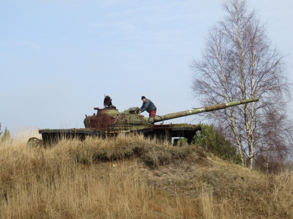 Jens Krüger vom Storchenhof Papendorf befestigt einen Nistkasten auf einem ausgedienten Panzer (Foto: F. Joisten)
