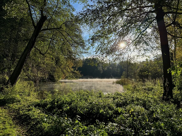 Ein wild bewachsener Teich im Nebel.
