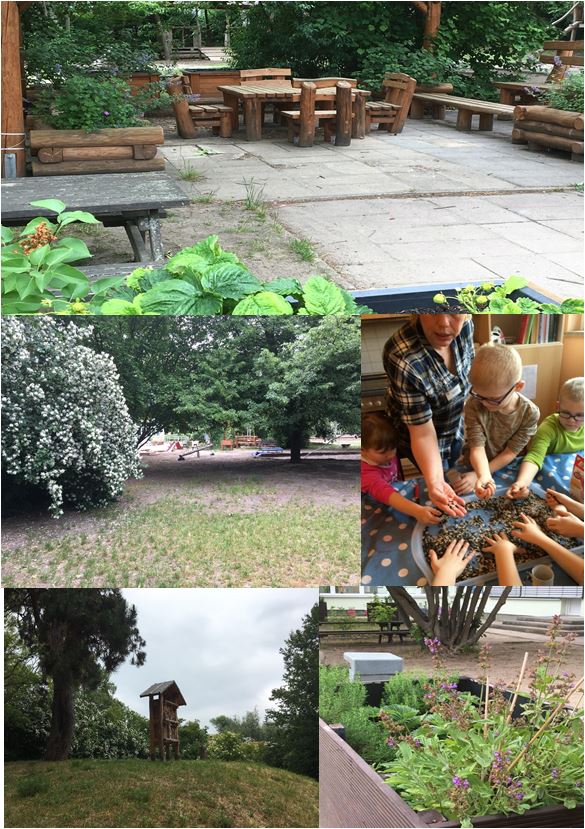 Auf dem Kita-Gelände entstand an verschiedenen Stellen, hauptsächlich jedoch im Innenhofbereich, für unsere Kinder ein Naturgarten. Diese Bereiche nutzen die Kinder gleichfalls als „Natur-und Umweltexperimentierzimmer“. Mit der Umsetzung des Vorhabens konnte dank der Förderung der Stadt Eberswalde für Umweltprojekte im Jahr 2017 begonnen werden. Aus Mitteln der Stadt Eberswalde konnten die Hochbeete und die notwendige hochwertige Hochbeetpflanzerde angeschafft werden. Die Hochbeete konnten gemeinsam mit den Kindern und dem Hausmeister der Einrichtung errichtet werden.