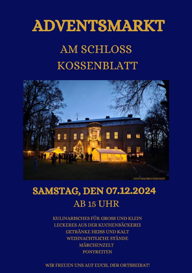 Am Samstag, den 06. Dezember 2025, findet wieder der Kossenblatter Adventsmarkt auf dem Schlossparterre statt.