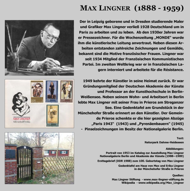 Zusammen mit Veröffentlichungen von und über Max Lingner werden die Grafiken im Heimathaus zum ersten Mal in einer kleinen Ausstellung gezeigt. Die Präsentation ist ein Beitrag zur 700 Jahrfeier von Prieros.