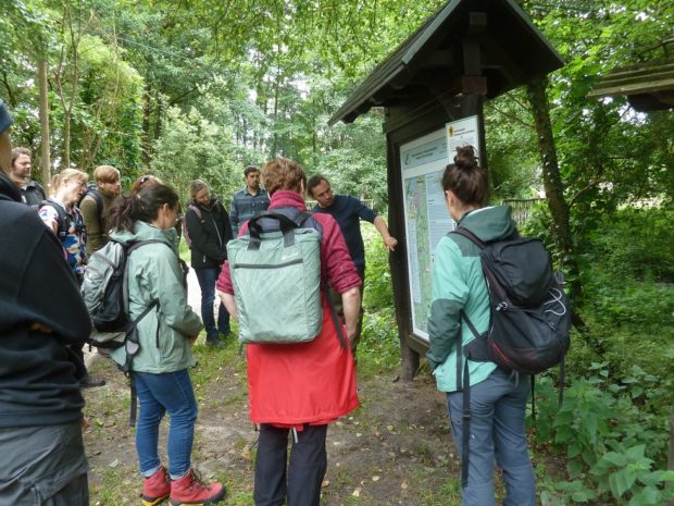 Bei einem Zwischenstopp an einer anderen Uferstelle des Rheinsberger Rhin wurden weitere Maßnahmen zur Pflege des Waldes vorgestellt, wie das Entfernen von angepflanzten Fichten. Diese verdunkeln den Lebensraum der eigentlich im Auwald vorkommenden Erlen. Michael Zauft ging zudem genauer auf den logistischen Aufwand einer Bachsanierung ein. Der Transport von großen Mengen Kies an unzugängliche Stellen ist beispielsweise sehr aufwändig, aber nötig, um eine gesunde Bachsole mit wenig Sediment herzustellen, in der die Bachmuscheln leben und filtrieren können. Auch das Belassen von Totholz ist essentiell für die Entstehung von artenreichen Flachwasserzonen, stellt aber auch ein Konfliktpotential mit dem Paddelbetrieb dar. Dieser unterliegt deswegen klaren Regelungen vonseiten des zuständigen Naturparks.