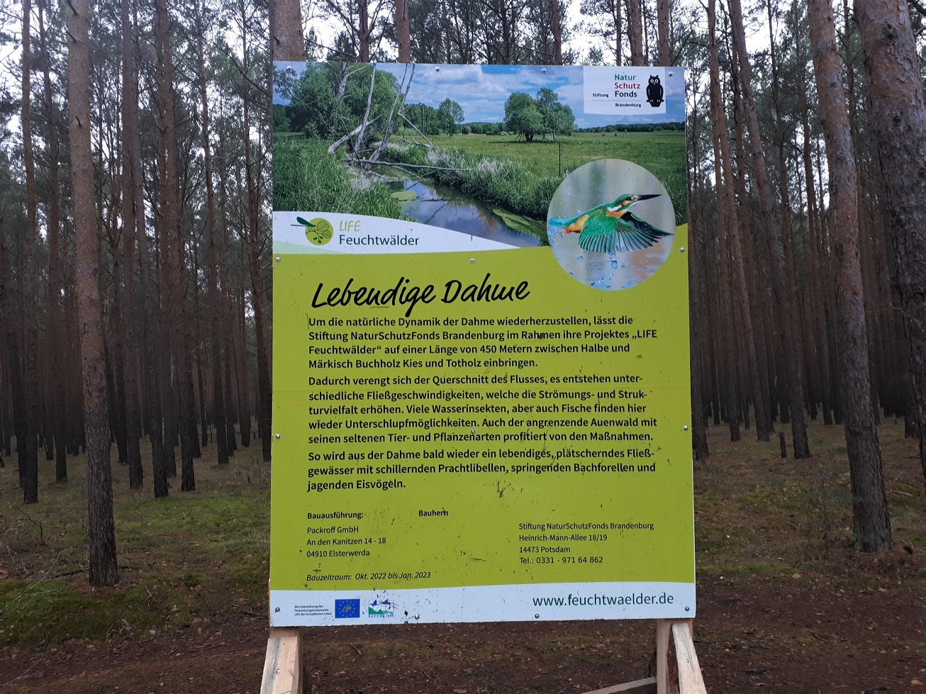 Viele Wasserinsekten, aber auch Fische sollen hier wieder Unterschlupfmöglichkeiten finden. Auch der angrenzende Auenwald mit seinen selten Tier- und Pflanzenarten profitiert von den Maßnahmen. So wird aus der Dahme bald wieder ein lebendiges, plätscherndes Fließgewässer mit schillernden Prachtlibellen, springenden Bachforellen und jagenden Eisvögeln.