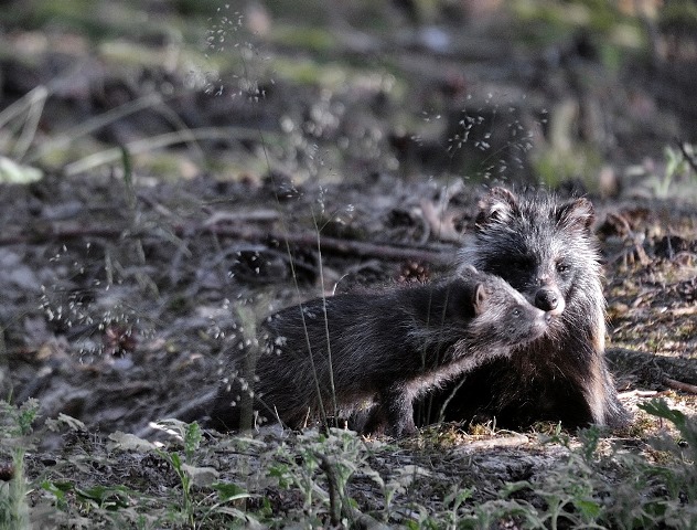 Ich teilte mir das Fotorevier mit einem Jäger. Als ich eines Tages auf Dachse ansaß, erschien eine Marderhundfähe vor dem Bau mit ihrem Nachwuchs und säugte diesen. Ein seltener Anblick.