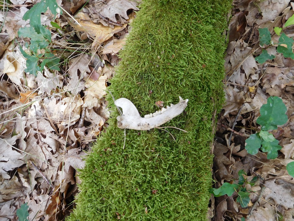 Neben dem Baum fand ich einen Teil eines kleinen seitlichen Unterkiefers, bei dem es sich vermutlich um einen Frischling handelt, also ein sehr junges Wildschwein. Als Allesfresser hat dieses sowohl im vorderen Bereich raubtierhafte Zähne und weiter hinten Zähne, die auch Pflanzen gut verarbeiten können (s. Bild).