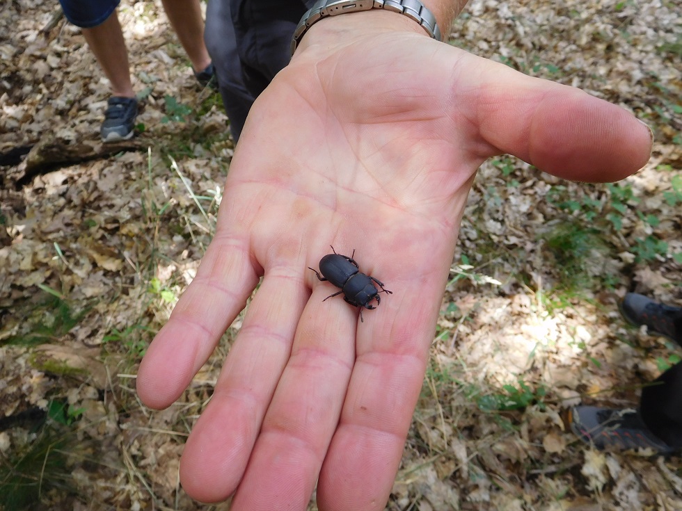 Wenige Meter weiter hielt die Gruppe an einer alten Eiche an. Diese hatte ich neugierig umrundet und dabei einen schwarzen Käfer unter der Eiche entdeckt, der nicht damit einverstanden war, fotografiert zu werden. Ein Teilnehmer hat mir seine Hand zur Verfügung gestellt, damit ich beide Hände frei zum Fotografieren hatte. Ich meine, es handelt sich um einen Balkenschröter (Dorcus parallelipipedus). Das ist ein Käfer aus der Familie der Schröter (Lucanidae), der tag- und nachaktiv ist, sich von Baumsäften ernährt und zwischen Mai und Juli in Laubwäldern mit altem Baumbestand unterwegs ist.