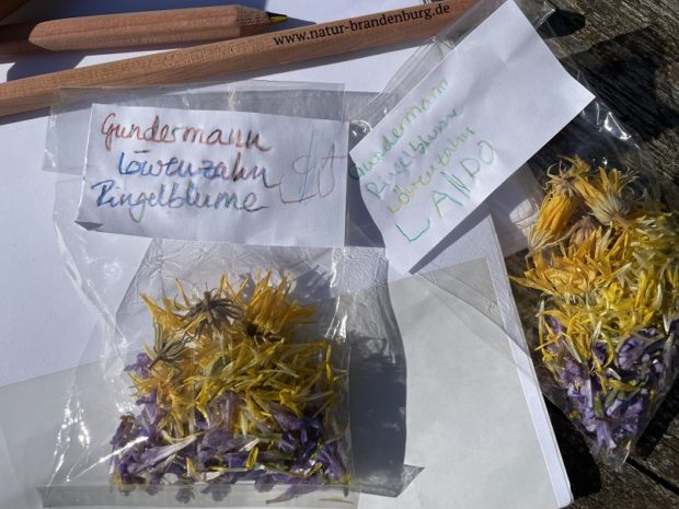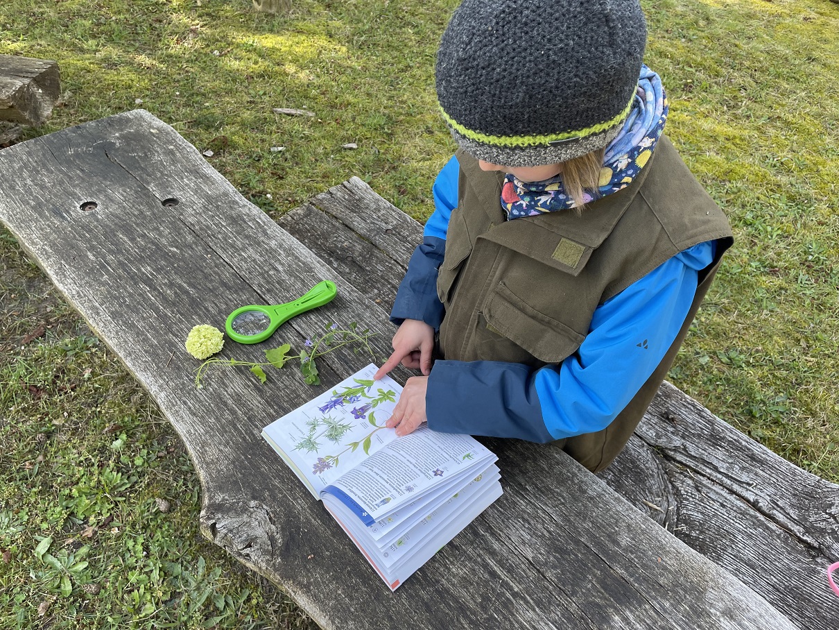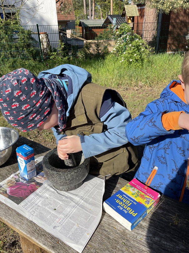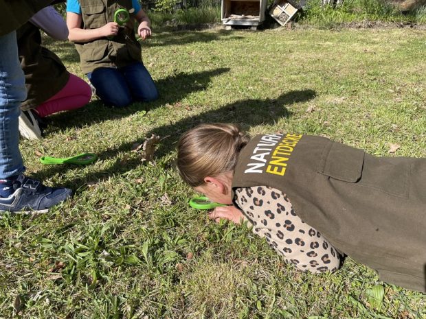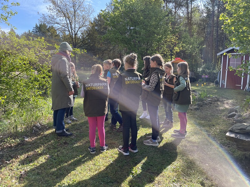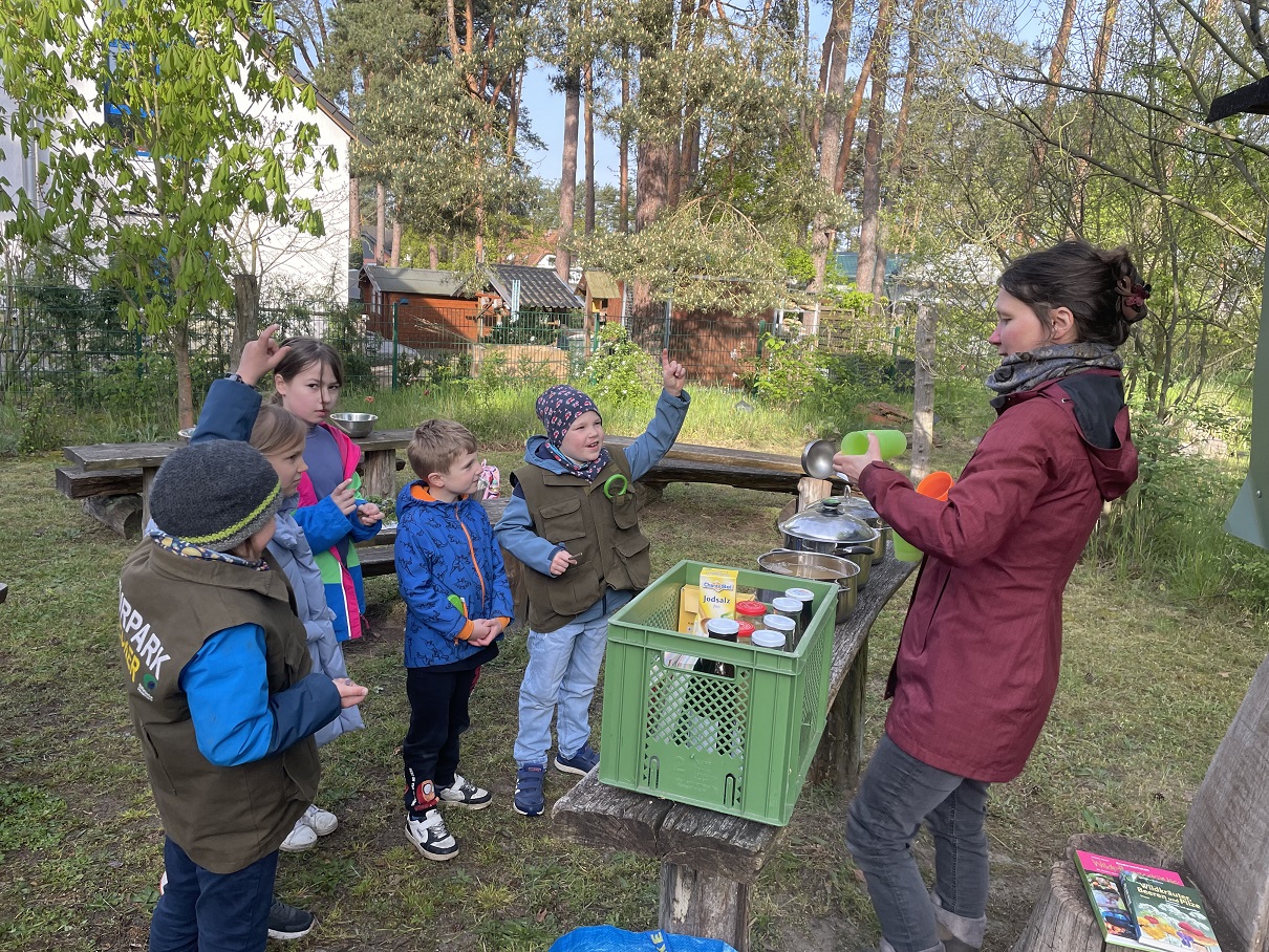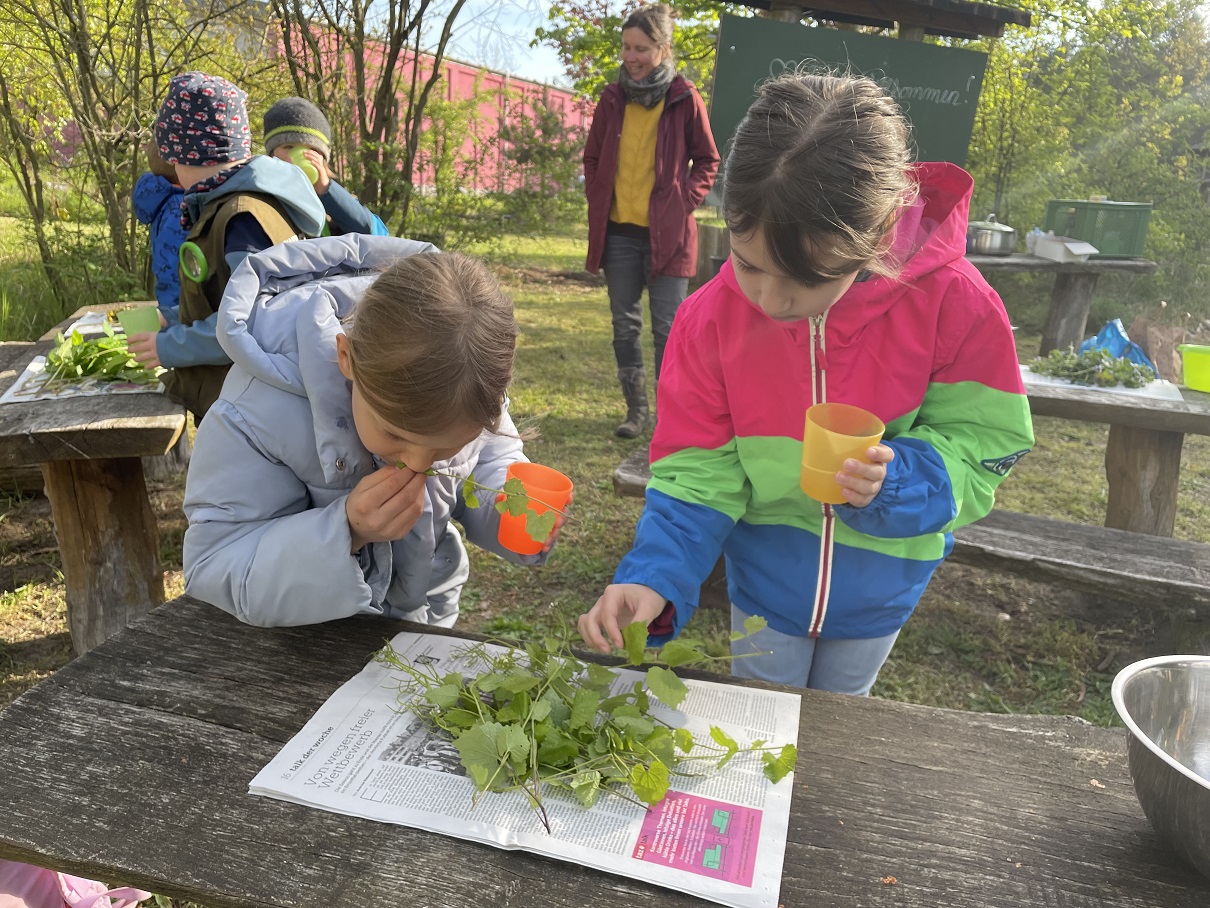 Mitarbeiterinnen der Naturpark-Verwaltung weckten mit dem Bestimmen von Wildkräutern und Waldbaden-Erfahrungen großes Interesse und brachte den Kindern die Natur näher. Die Kinder konnten frische Wildkräuter-Limonade kosten, eigenes Wildkräuter-Salz herstellen und beim Entdecken von Pflanzen und Insekten im Schulgarten mit allen Sinnen entspannen.
