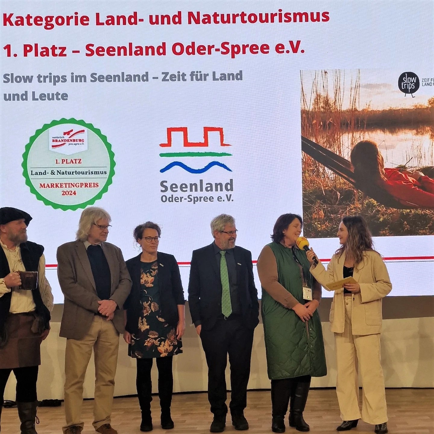 In der Kategorie Land- und Naturtourismus belegte der Tourismusverband Seenland Oder-Spree e.V. den 1. Platz für „Slow trips im Seenland – Zeit für Land und Leute“. Mit diesen Angeboten haben Besucher die Gelegenheit selbst kreativ zu werden und aktiv mitzumachen. Bei Nischenprodukten, von leicht unkonventionell bis zu komplett ausgefallen, geben Einheimische einen Einblick in ihr Leben und lassen die Gäste daran teilhaben. Brauen und backen, Wildkräuter sammeln und verarbeiten, musizieren mit Steinen, Fische fangen, Fossilien suchen, Glasperlen herstellen, Waldbaden, eine Orgelpfeife bauen, mit Alpakas und Eseln wandern oder persönliche Kunstwerke mit Farbe oder Kamera herstellen: Den Auftakt für die Entwicklung der slow trips bildete ein internationales Leader-Projekt mit der LAG Märkische Seen. Es geht dabei nicht auf das Abklappern von Sehenswürdigkeiten. Ganz im Gegenteil sollen und dürfen sich slow trips -Teilnehmer Zeit für Land und Leute nehmen und den Erzählungen der Einheimischen lauschen. Man wird zur Entschleunigung eingeladen und hat die Möglichkeit, regionaltypische Produkte kennenzulernen und besondere Handwerkskunst herzustellen, um reicher an Erfahrung und mit einem besonderen Erlebnis in der Tasche wieder nach Hause zu gehen.