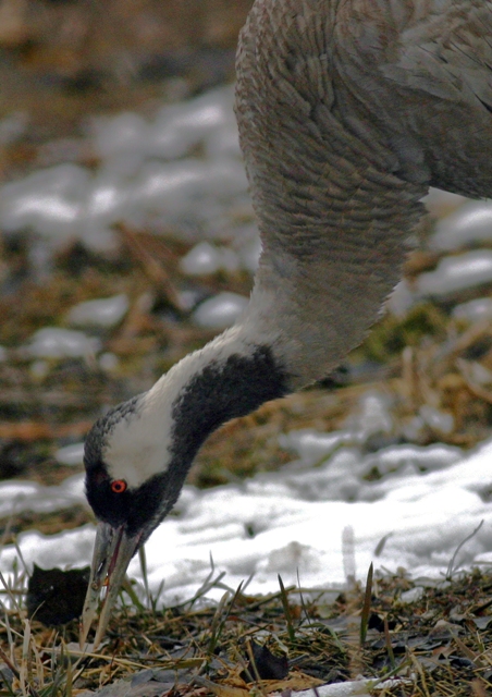 Kraniche können gut aus dem Auto heraus fotografiert werden. Natürlich darf man nicht aussteigen, auch das Licht sollte ausgeschaltet sein. Wenn ich Kraniche von der Straße aus fotografieren möchte, fahre ich zunächst an ihnen vorbei und überlege, wo ich gut anhalten könnte. Dann wende ich und fahre erst dann zurück, wenn aus der entgegengesetzten Richtung ein Auto, möglichst ein Lkw, kommt. An der geplanten Stelle kann ich dann problemlos anhalten und schalte dort sofort den Motor aus. Meistens fühlt sich der Kranich nicht gestört, da sich seine ganze Aufmerksamkeit auf das fahrende Auto konzentriert. So auch bei dem Kranich im Schnee, der sich mir von ursprünglich vielleicht 25 bis auf zwei oder 3 Meter näherte. Der Kranich auf der rechten Seite wurde im Frühjahr im Erlenbruch an der Dahme aus dem Paddelboot heraus fotografiert.