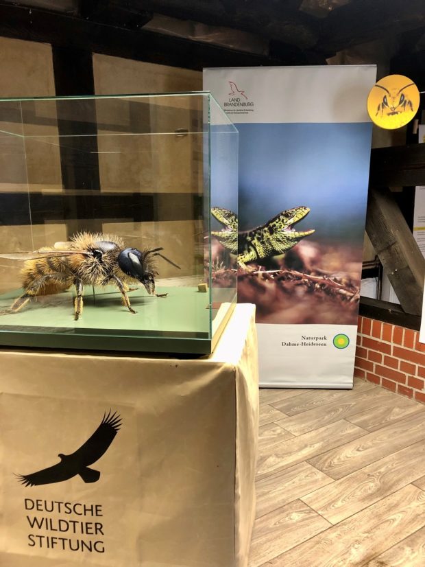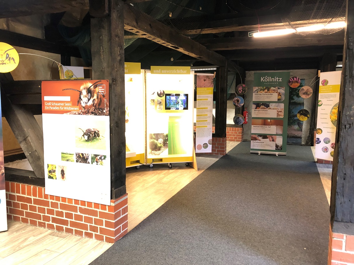 Ende Mai wurde die neue Wanderausstellung „Wildbienen – hoch bedroht und unverzichtbar“ im Naturgut Köllnitz in Groß Schauen (im ehemaligen Fischereimuseum) eröffnet. Teresa Zeuner vom Naturpark Dahme-Heideseen, Holger Ackermann, Imker und Sprecher des Landes-Imkerverbands, und Christian Vieth, Geschäftsführer der Landgut Köllnitz GmbH, eröffneten die Ausstellung.