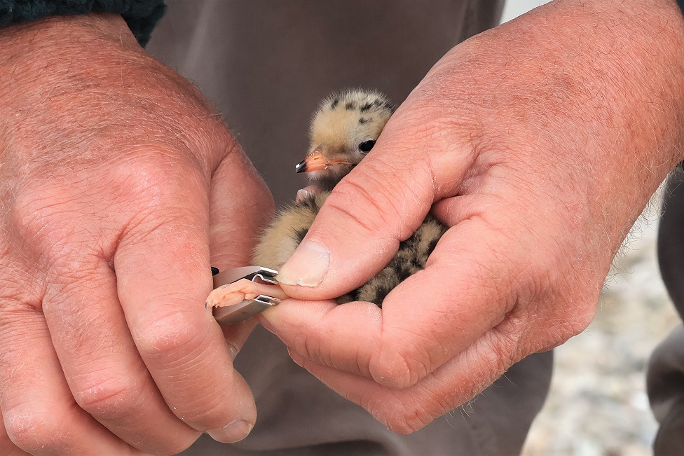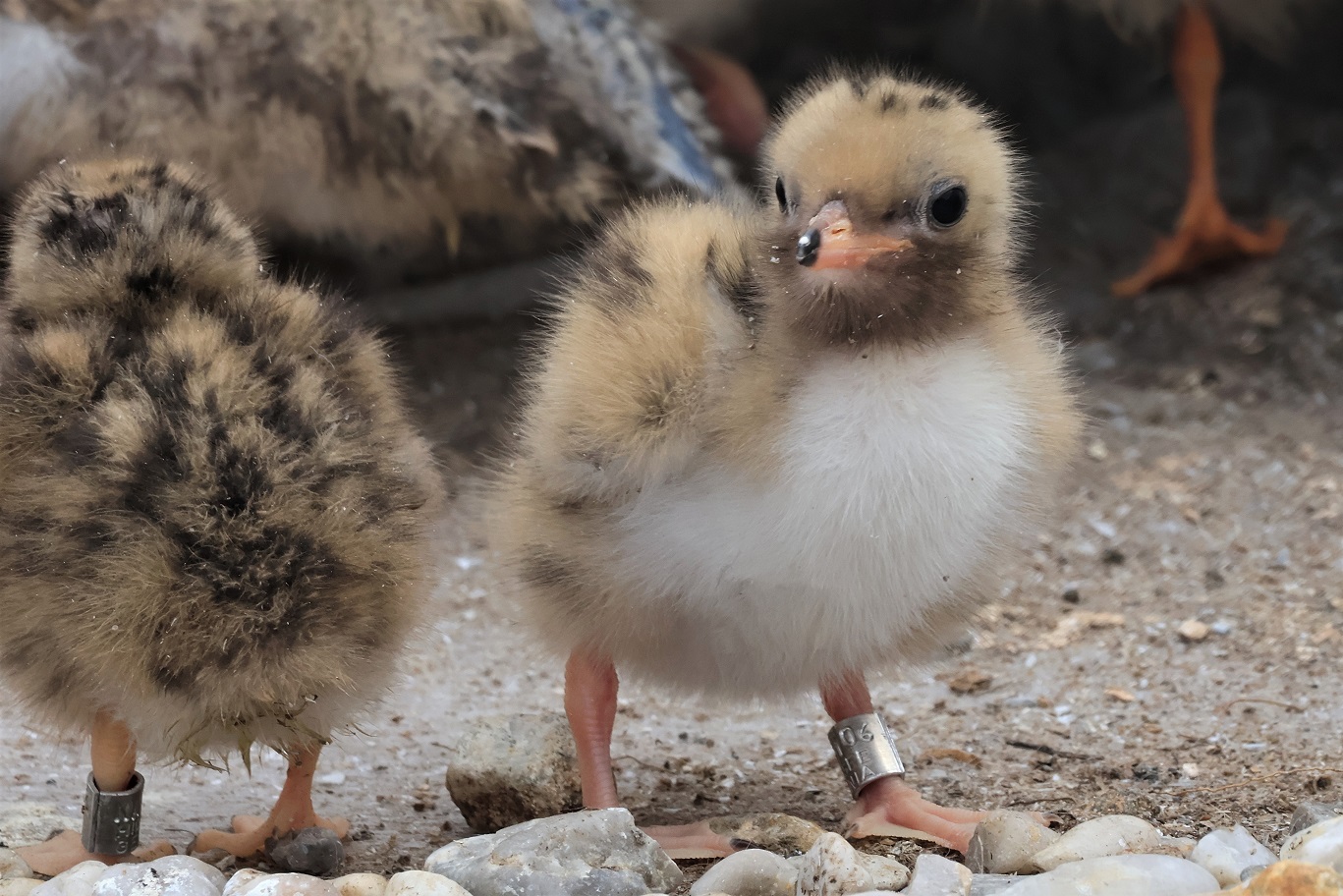 Die Jungtiere werden ausschließlich zur Zählung und Beringung gestört. Ornithologe Hartmut Haupt nahm auch dieses Jahr die Markierung der Küken vor, unterstützt von Tim Funkenberg von der Heinz-Sielmann-Stiftung und Theresa Schwalbe von der Naturwacht des Naturparks Dahme-Heideseen. Jeder beringte Vogel erhält einen leichten Metallring mit individuellen Daten, um sein Leben und Zugverhalten zu verfolgen. Diese Informationen werden im zentralen Register der Vogelwarte Hiddensee erfasst. Insgesamt konnten 21 Jungvögel beringt werden. Noch sind einige Eier nicht ausgebrütet, und einige der jüngsten Küken waren zu klein für die Markierung. Somit erwiesen sich die künstlichen Brutinseln erneut als wertvolle Nistplätze für die gefährdete Vogelart.