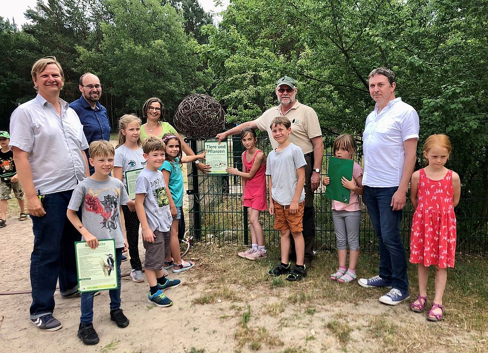 Warum trommelt der Buntspecht am Baum? Welche Besonderheiten hat die Rinde der Hängebirke? Diesen und weiteren Fragen können die Schülerinnen und Schüler der Naturparkschule Prieros auf dem neuen Naturlehrpfad nachgehen. Am 28. Juni weihten Schüler-Reporter und ihr Betreuer Lars Busam die 20 Tafeln des Naturlehrpfades offiziell ein. Die Tafeln sind ein Gemeinschaftsprojekt der Naturparkschule und dem Hort Prieros, der BLB Werbung, der Naturwacht und der Naturparkverwaltung Dahme-Heideseen.