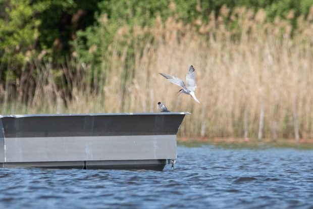 Die weißgrauen Flussseeschwalben mit schwarzer Kappe sind von ihrem Langstreckenflug aus Afrika zurück und haben die neuen Brutinseln auf dem Groß Schauener See bei Storkow bezogen. Die Heinz Sielmann Stiftung hat mit praktischer Unterstützung der örtlichen Fischerei Köllnitz in diesem Frühjahr zwei künstliche Brutinseln installiert, um den stark gefährdeten Vögeln mehr passende Brutplätze anzubieten.