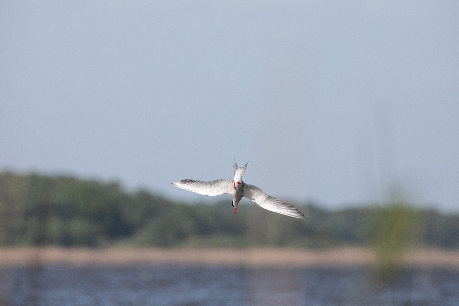 Aus dem Flug stürzen sie von oben herab in das Wasser, tauchen kurz ein und schnappen sich ihre Beute. Die Flussseeschwalbe ist bekannt für ihre eleganten und präzisen Flugkünste. Diese tragen die 33 bis 39 Zentimeter großen Zugvögel im Herbst und Frühjahr viele Tausende von Kilometern bis nach West- und Südafrika und zurück.