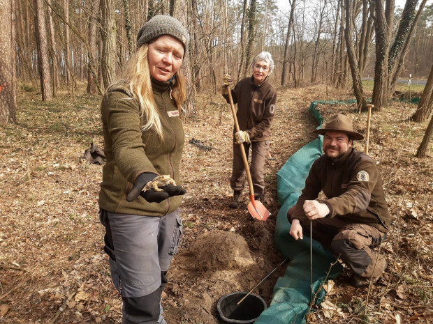 Die Naturpark-Ranger Hannes Hause, Theresa Schwalbe und Sabine Schmidt (v. l.) beim Bau des Amphibienzaunes bei Limsdorf, einem Ortsteil von Storkow, im Naturpark Dahme-Heideseen. © Foto: Elke Lang