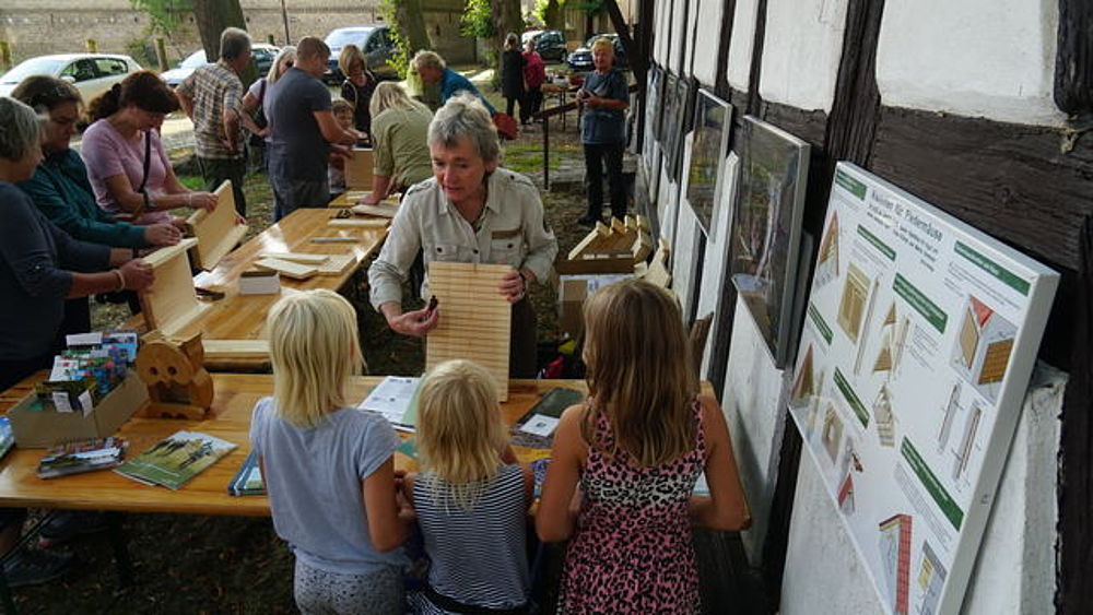 Ab 18:00 Uhr können an der Fachwerkkirche Groß Schauen Fledermaus-Sommerquartiere gegen eine Spende selbst gebaut werden.