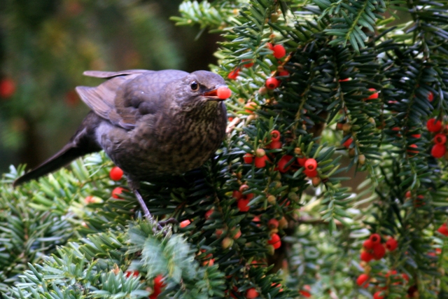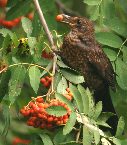 Dabei ist sie erst in neuerer Zeit als Bewohnerin des Waldes in die Städte gezogen und fühlt sich hier, nicht nur in Gärten und Parks, ausgesprochen wohl. Vielfach überwintert sie bei uns, so dass wir sie das ganze Jahr über beobachten können. Dankbar ist sie, wenn wir ihr im Herbst Blätter zwischen den Stauden und Blumen liegen lassen, so dass sie nach Würmern suchen kann. Und im Herbst verschmäht sie kaum eine Beere, wie man auf den Fotos sehen kann.