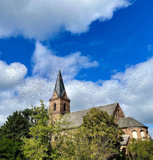 Spektakulär war dieser Abflug eines riesigen Staren-Schwarms über der Kirche in Prieros. Einige Stare überwintern bei uns und verzichten auf den Kraft raubenden Zug in den Süden Europas. Welchen Weg dieser Schwarm wählte, bleibt nur zu erahnen.