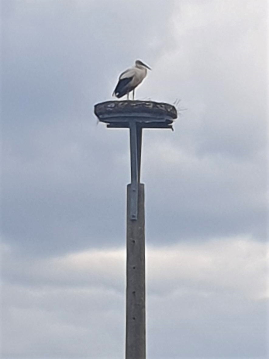 Im Februar 2024 wurde ein neuer Storchenhorst an der Gläsernen Molkerei in Münchehofe aufgestellt. Jetzt haben erste Störche das Nest entdeckt. Sabrina Glass vom Hofladen der Gläsernen Molkerei ist ein Foto gelungen.