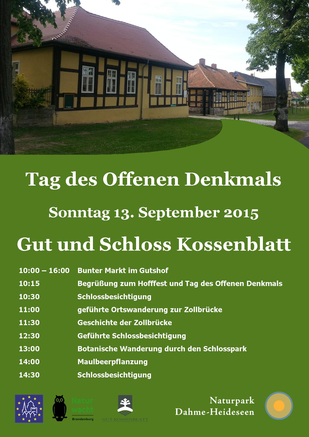 Dem Motto des diesjährigen Denkmaltages „Handwerk, Technik, Industrie“ entsprechend, wird an diesem Tag auf dem Gutshof Kossenblatt  buntes Treiben herrschen. Dabei werden sich alte Handwerke vorstellen, kann alte und neue Technik des ländlichen Lebens entdeckt werden.