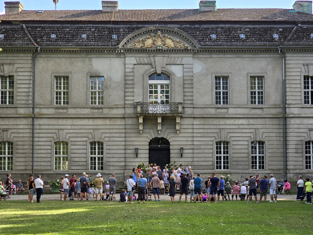 Um 16 Uhr fanden sich dann nochmal einige Leute zu einem Auftritt des Spreechors auf der Schlosstreppe ein, bevor um 17 Uhr die Veranstaltung ihren Abschluss fand mit der traditionellen Pflanzung des Maulbeerbaums durch unser Naturpark-Team. So wie der Maulbeerbaum an die Kulturgeschichte der Gegend erinnert, so erinnert auch Schloss Kossenblatt daran und wir hoffen, dass sich beide auch in den nächsten Jahren gut entwickeln.