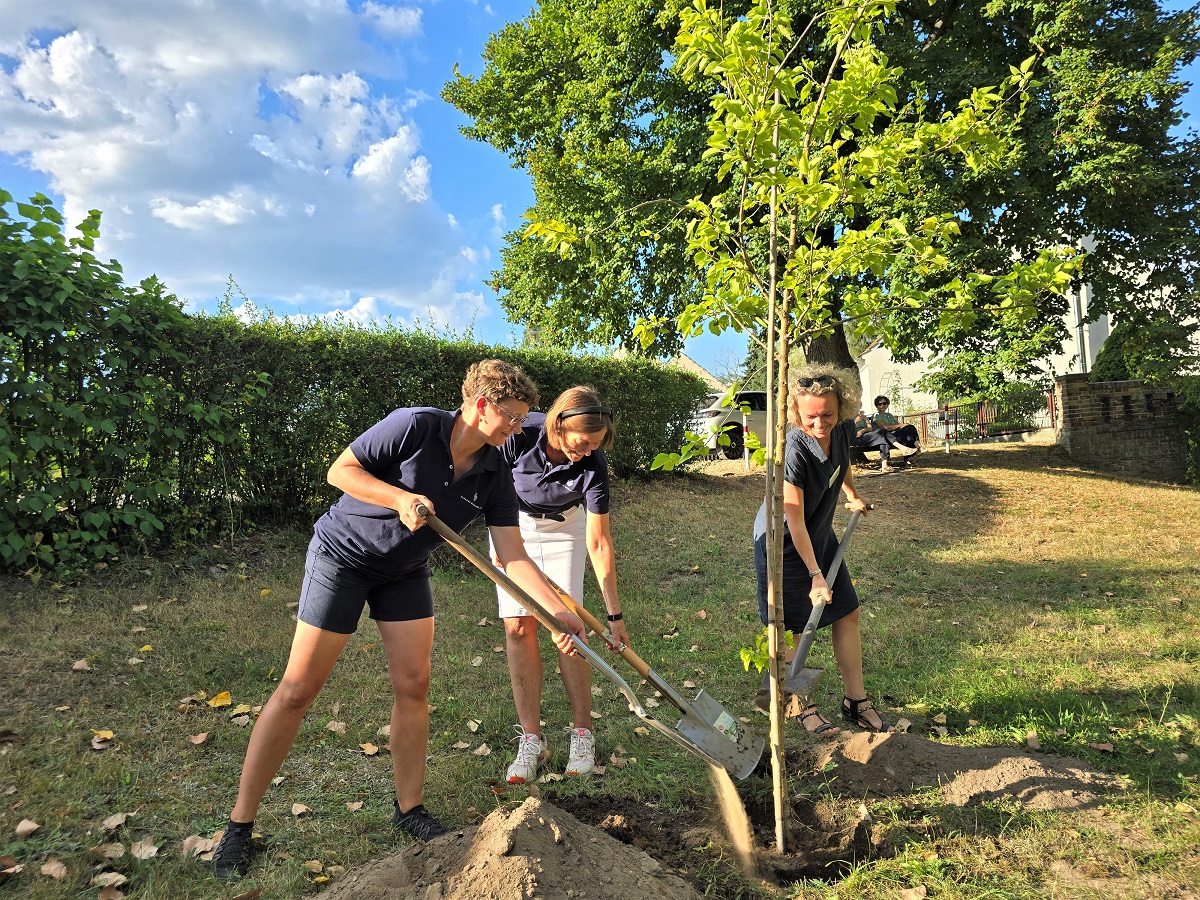 Pflanzung Maulbeerbaum mit Frau Schwarz (Ortsbeirat Kossenblatt), Frau Schürmann und Frau Zeuner (Naturpark Dahme-Heideseen) v.l.n.r. (© Carsten Preuß)