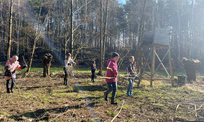 Die Bewegung an der frischen Luft tut den Kindern sichtlich gut. Aufgeteilt in zwei Gruppen, tummelt sich abwechselnd eine Hälfte der Kinderschar auf der Wiese, während die andere Gruppe eine Waldrunde mit dem Förster dreht. Dabei können die Kids ihr Waldwissen testen. Schnell steht fest, dass es sich um waschechte Naturparkschülerinnen und -schüler handelt, denn sie kennen sich bereits sehr gut mit heimischen Wildtieren und Baumarten aus. „Die Tour mit dem Förster war toll. Am besten hat mir aber das Schneiden mit der Astschere gefallen. Das ist ganz schön anstrengend, aber macht total Spaß“, resümiert Lotte den Tag.