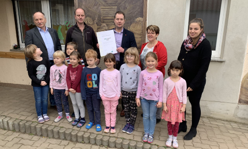 Zur feierlichen Übergabe von Plakette und Urkunde erschienen neben den „Mühlenmäusen“ auch Bürgermeister Lothar Schneider, Axel Mitzka vom Naturpark | Verein Dübener Heide e.V., AWO Nordsachsen Geschäftsführer Marko Schreiber, Kita-Leiterin Silvana Klugmann und Lisa Böhme (v.l.).