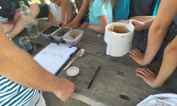 Die Kinder haben den pH-Wert des Teiches gemessen und die Wasserhaltefähigkeit verschiedener Böden bestimmt. So lernten sie zum Beispiel, dass ein sandiger Boden schwerer als lockere Gartenerde ist, aber weniger Wasser speichert. Anschließend kescherten sie in Kleingruppen im Authausener Teich. Die gefangenen Wasserläufer, verirrten Spinnen und Ameisen wurden mit großem Interesse in den Becherlupen bestaunt.