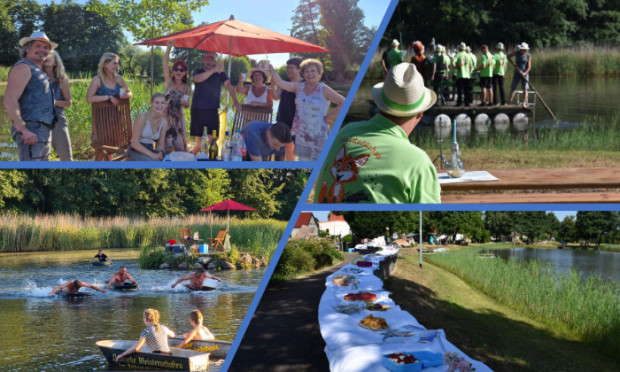 Törtchen, selbstgemachte Limonade und Bowle, Schnittchen, Käsespieße – die SchmerzerInnen ließen sich nicht lumpen und tafelten ordentlich auf. Für musikalische Unterhaltung sorgten die Heidefüchse, die „Go West“ und andere Klassiker sogar auf dem fahrenden Floß spielten. Dieses transportierte die Gäste gegen eine kleine Spende zur Teichinsel, wo sich eine Cocktailbar befand. Aus den Einnahmen wird eine Smiley-Ampel am Ortseingang aus Richtung Krina finanziert. Die Idee kam bei allen super an und das Spendenglas füllte sich.