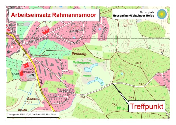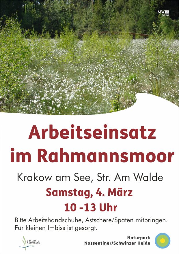 „Moor muss nass!“ ist das Motto des Arbeitseinsatzes des Naturparks Nossentiner/Schwinzer Heide. Der Arbeitseinsatz findet am Samstag, 4. März 2023, im Rahmannsmoor bei Krakow am See statt. Ziel ist, dem Moor zu mehr Wasser zu verhelfen, indem die aufwachsenden Gehölze entfernt werden. Helfende Hände sind gern willkommen!
