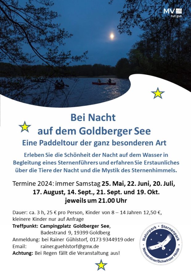 Erleben Sie mit mir die Mystik der Dämmerung und der Nacht beim Mondscheinpaddeln auf dem Goldberger See. Durch das eingeschränkte Sehvermögen und dem verstärkten Lauschen in die Nacht hinein machen wir ganz andere sinnliche Erfahrungen. Die nächtliche Atmosphäre auf dem Wasser bringt außerdem Entspannung und sorgt für Entschleunigung vom Alltag. Zunächst erfahren Sie Interessantes über Zusammenhänge in der Natur und im Weltall. Nach den Sicherheitshinweisen geht es raus auf den See. Dort gibt es spannende Informationen zu bekannten oder weniger bekannten Sternbildern, deren mythischen Geschichten, wie sie seit mehr als tausend Jahren erzählt werden, sowie interessante Informationen zu den Tieren der Nacht. Das macht diese Erlebnistour zu einem ganz besonderen Abend.