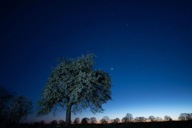 Im Westen, unweit der Sternbilder Stier und Plejaden, ist die Venus am Abendhimmel zu beobachten. Im Vordergrund steht ein alter Birnbaum in voller Blüte. Foto: Evelin Kartheuser