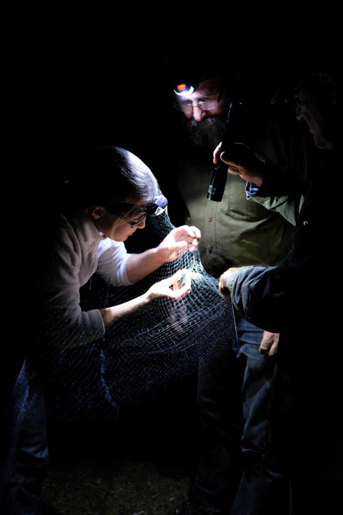 Um die Wartezeit zur Mondfinsternis zu überbrücken, begleiteten die Besucher die Fledermausspezialisten Ralf Koch und Christina Burger beim Nachtfang. Dazu wurde ein 6m hohes Fangnetz am Brillensee aufgestellt. Bereits nach wenigen Minuten verfing sich die erste Wasserfledermaus. Vorsichtig lösten die Spezialisten die Tiere aus dem Netz. Die Fledermaus konnte nun bestimmt und gewogen werden. Auf diese Weise erhalten die Fledermauskundler einen Überblick über die vorkommenden Arten.