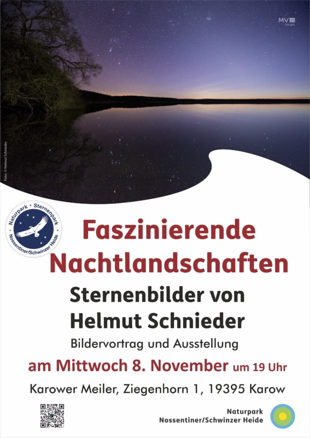 Mit seinen außergewöhnlichen Sternenhimmel-Aufnahmen ist Helmut Schnieder inzwischen weit über das Wendland, seine Wahlheimat, bekannt. Er wurde mit internationalen Preisen ausgezeichnet. Helmut Schnieder, der eigentlich Chemiker im Ruhestand ist, fotografiert seit seiner Jugend. Dazu kommt seine Begeisterung für Astronomie. Seit Jahren unterstützt er Initiativen zum Schutz des Nachthimmels. So auch den Sternenpark Nossentiner/Schwinzer Heide. Hier im Naturparkzentrum Karower Meiler sind in diesem Herbst seine Astro-Landschaftsaufnahmen in einer Sonderausstellung zu sehen. Am Mittwoch, dem 8. November 2023, kommt Helmut Schnieder auch persönlich nach Karow. In einem Bildervortrag zeigt er seine Aufnahmen, dazu gibt es Wissenswertes über den Sternenhimmel, das Universum sowie die teilweise abenteuerlichen Geschichten von seinen nächtlichen Foto-Safaris. Mit dabei hat Helmut Schnieder dann auch sein Buch „Sternennächte im Vierländereck“, einen streng limitierten Bildband, der mit seinen kunstvoll komponierten Bildern einen neuen Blick auf die Schönheit dieser Erde bietet.
