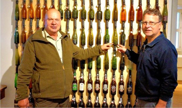 Museumsleiter Dr. Fred Ruchhöft (r.) und Ranger Henry Fritz: Eine große Sammlung von Waldglas-Flaschen ist im Goldberger Heimatmuseum zu sehen. FOTO: HELGA WAGNER