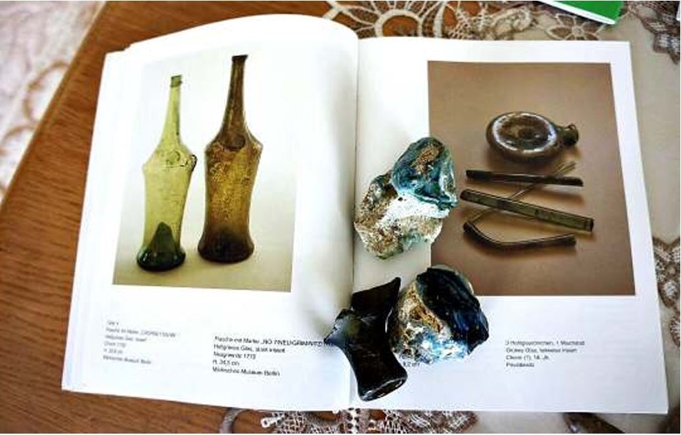 „Langsam verdichtete sich so das Bild, wo Glashütten einst gestanden haben mussten“, sagt sie. Es war wohl auch ein Geschenk, dass sie sich beide so für diese heimatkundlichen Forschungen in Mecklenburg interessierten. Beide waren zugezogen aus der Uckermark und arbeiteten in ganz unterschiedlichen Berufen: sie als Zahnärztin und er als Justiziar. „Mein Mann war Spezialist für alte Karten“, verrät sie. „In denen waren manchmal auch schon Glashütten eingezeichnet.“ So machten sie sich nach all den Studien auf den Weg und suchten nach Hinweisen in der Natur, wo es einst Glashütten gegeben haben könnte. „Auf Äckern fanden wir oft Scherben, hell- oder dunkelgrün, manchmal auch Zapfen und mit Glas überzogene Steine oder auch Ziegelschutt. − Es war eine schöne Zeit“, sagt sie. „Alles vorbei, leider.“ Ihr Mann ist vor vier Jahren gestorben. Sie ist jetzt 87.