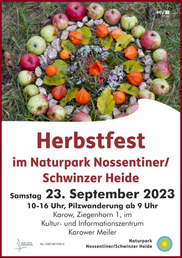 Am Samstag, 23. September 2023, laden der Naturpark Nossentiner/Schwinzer Heide und sein Förderverein von 10-16 Uhr zum traditionellen Herbstfest ein. Hier kann in entspannter Atmosphäre geklönt und geschlemmt werden.
