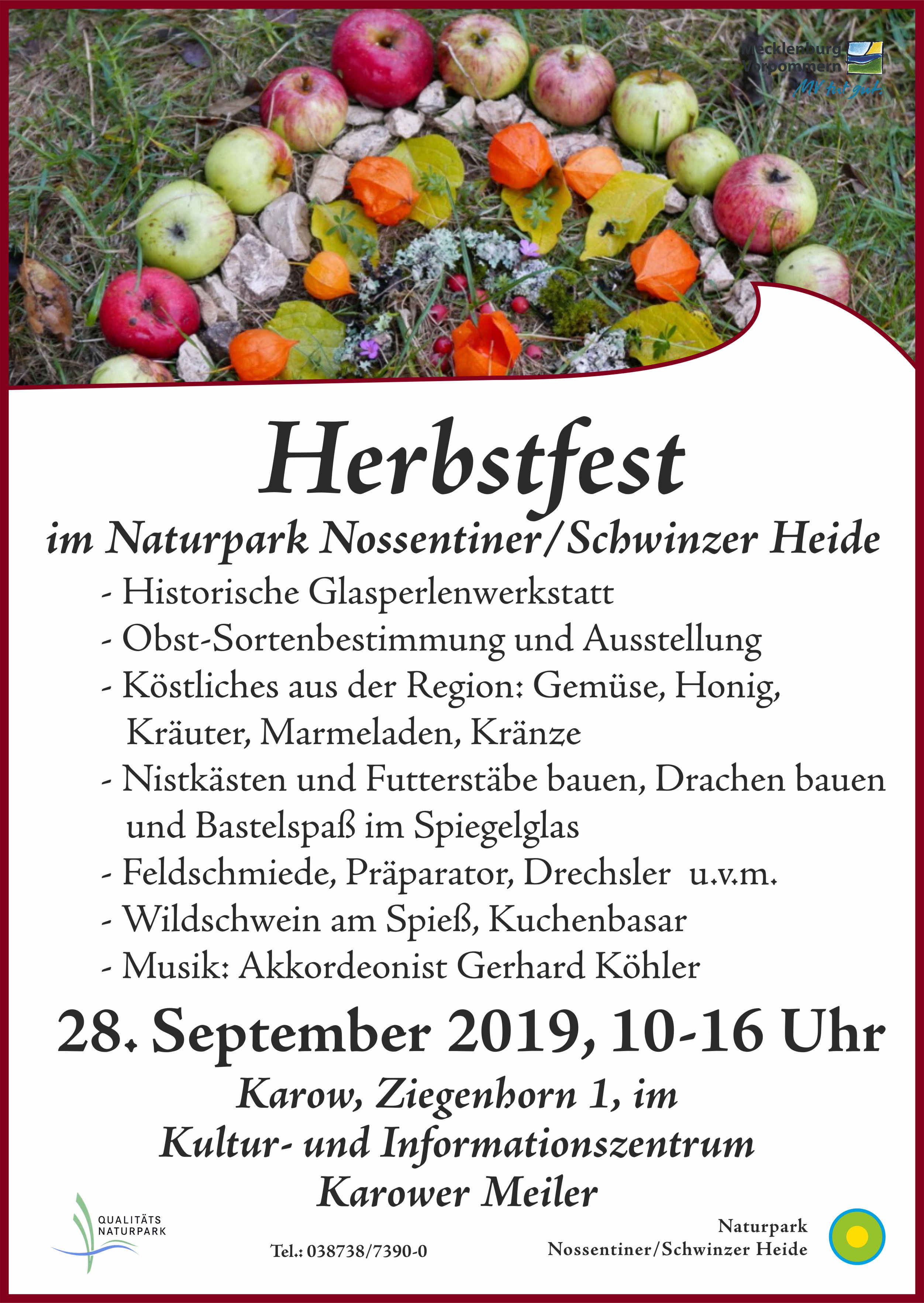 Am Samstag, 28. September, laden der Naturpark Nossentiner/Schwinzer Heide und sein Förderverein 10-16 Uhr zum traditionellen Herbstfest ein. Hier kann in entspannter Atmosphäre geklönt und geschlemmt werden.