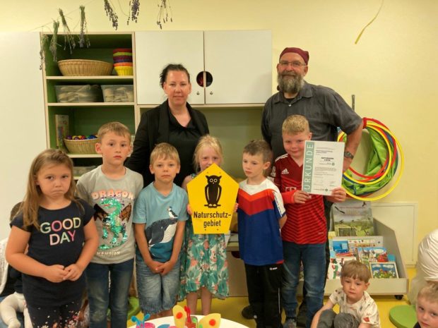 Nossentiner Hütte. Aufgeregte Stimmen und Gelächter von Kindern füllten den Raum der Kita „Grünschnäbel“ in Nossentiner Hütte: Es ist Morgenkreis-Runde, zusammen mit den Erzieherinnen wird gesungen, geklatscht und sich bewegt. Tamme und Lina tragen ein Gedicht vor unter der Girlande aus Lavendelsträußchen. „Heute ist ein ganz besonderer Tag“, eröffnete Claudia Kalden-Hoffmann, Leiterin der Kita, die Runde und erzählt über das anstehende Sommerfest, welches zugleich Abschlussfest der Vorschulkinder war. An diesem Festtag gab es aber noch einen weiteren wichtigen Programmpunkt, nämlich die Verleihung des Titels: „Naturpark-Kindergarten“. Die Auszeichnung wurde von Ralf Koch, dem Leiter des Naturparks Nossentiner/Schwinzer Heide, zusammen mit dem Schild der schwarzen Eule auf gelbem Grund – dem Symbol für Naturschutz, überreicht.
