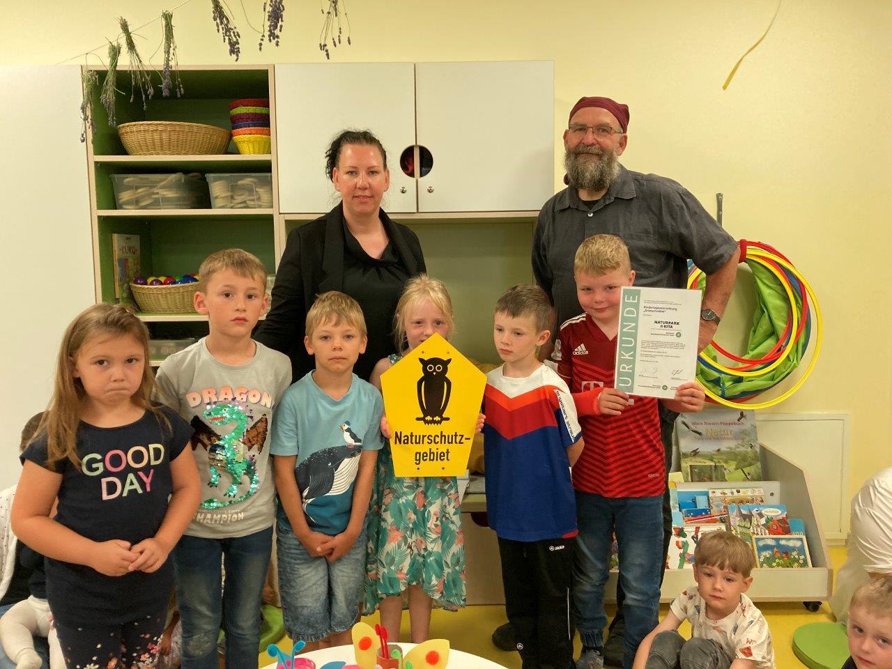 Ralf Koch, Leiter des Naturparks Nossentiner Schwinzer Heide (rechts im Bild) überreichte das Zertifikat „Naturpark-Kindergarten“