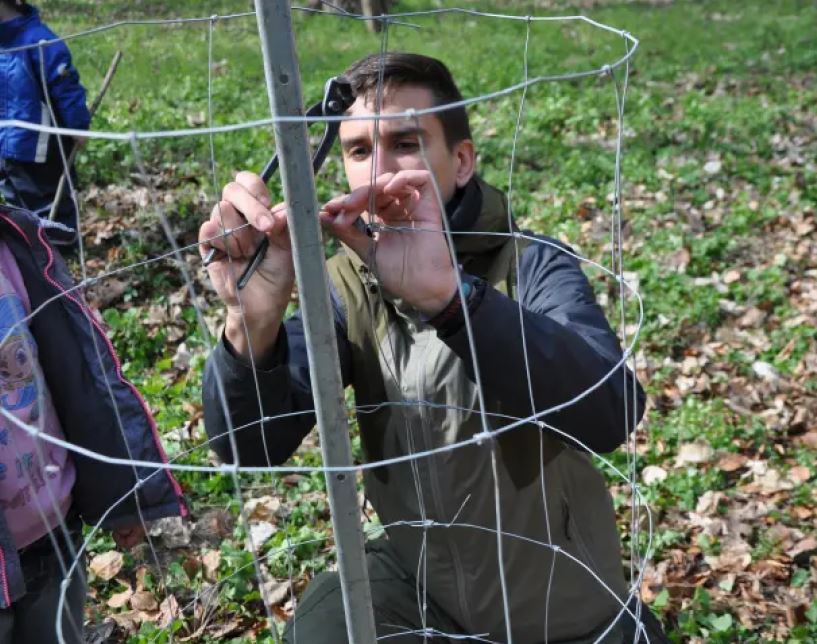 Damit die Bäume nicht gleich abgefressen werden, ummantelt sie FÖJler Till Rosellen mit einem Schutzzaun. FOTO: ALEXANDER BLOCK