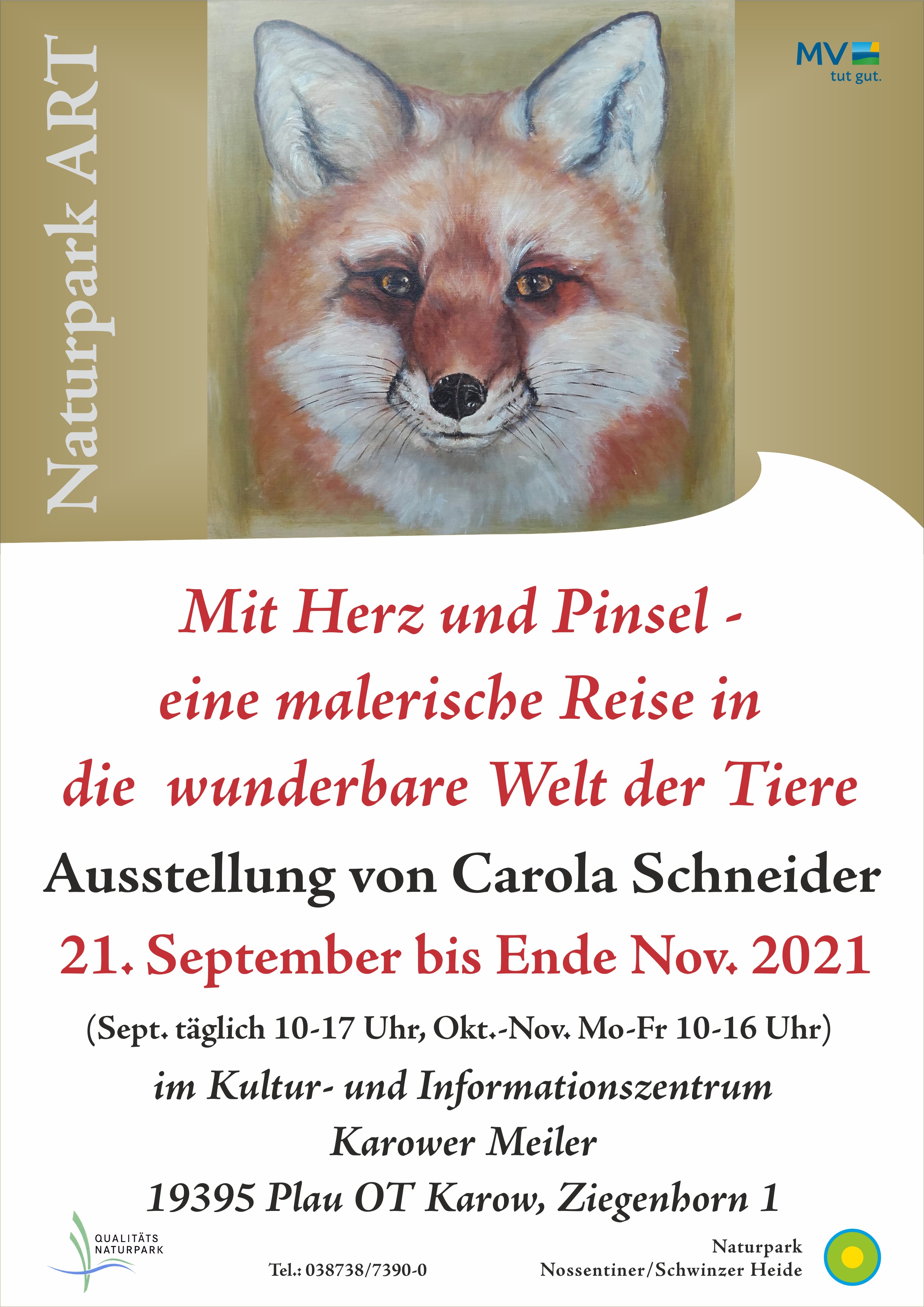 Die Ausstellung im Karower Meiler zeigt einen Überblick von Carola Schneiders Arbeiten der letzten fünf Jahre. „Tiermalerei ist für mich Faszination, Leidenschaft und ganz große Herzenssache für diese wundervolle Welt, in der wir leben. Und die gilt es zu achten, zu beschützen und zu bewahren – heute mehr denn je“, so die Malerin.