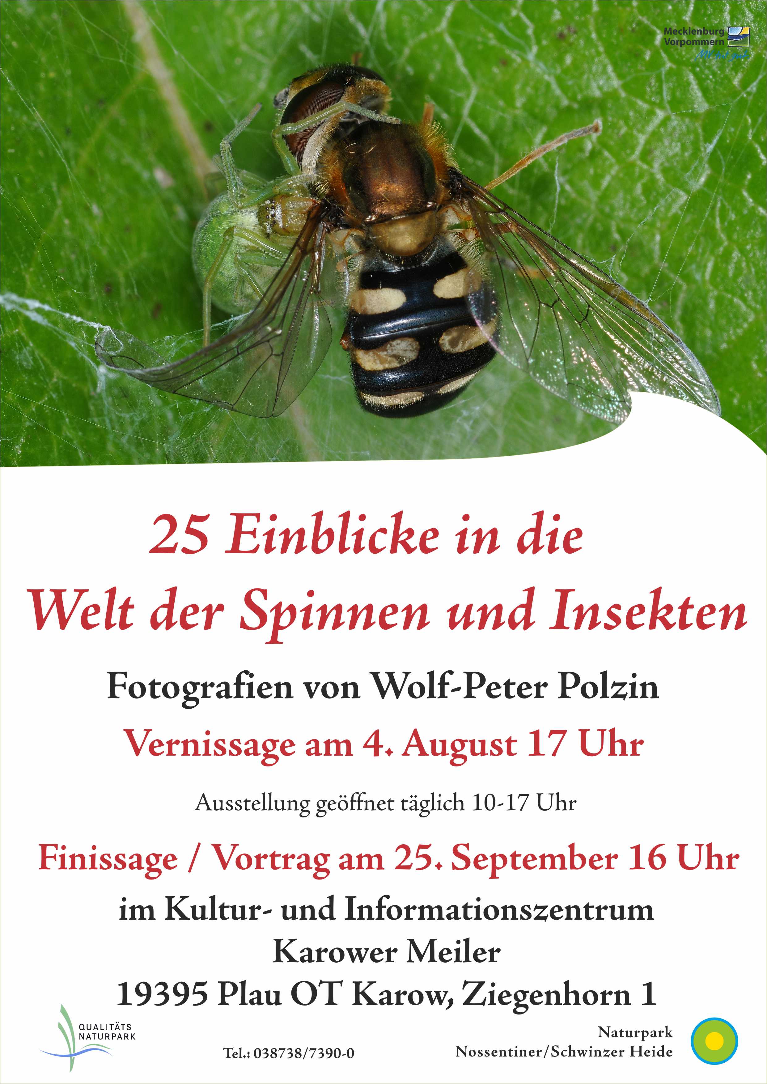 Die neue Ausstellung, die ab 4. August im Naturpark Nossentiner/Schwinzer Heide zu sehen ist, zeigt in großformatigen Bildern verschieden Insekten- und Spinnen-Arten. Der Fotograf Wolf-Peter Polzin eröffnet mit seinen Makroaufnahmen eine Welt voller Details, die mit bloßem Auge nicht sichtbar sind. Sie bilden einen Querschnitt durch die Artenvielfalt der Gliederfüßer ab, der aber natürlich nicht repräsentativ sein kann. Dabei handelt es sich größtenteils um recht gewöhnliche Arten, die die meisten Menschen trotzdem noch nie zur Kenntnis genommen haben, etwa weil sie ein verstecktes Leben führen, nachaktiv oder einfach nur zu schnell sind – oder eben auf der Sympathieskala ziemlich weit unten stehen. Begleitende Texte zu den Fotos weisen auf das Leben und die Ökologie der Tiere hin.