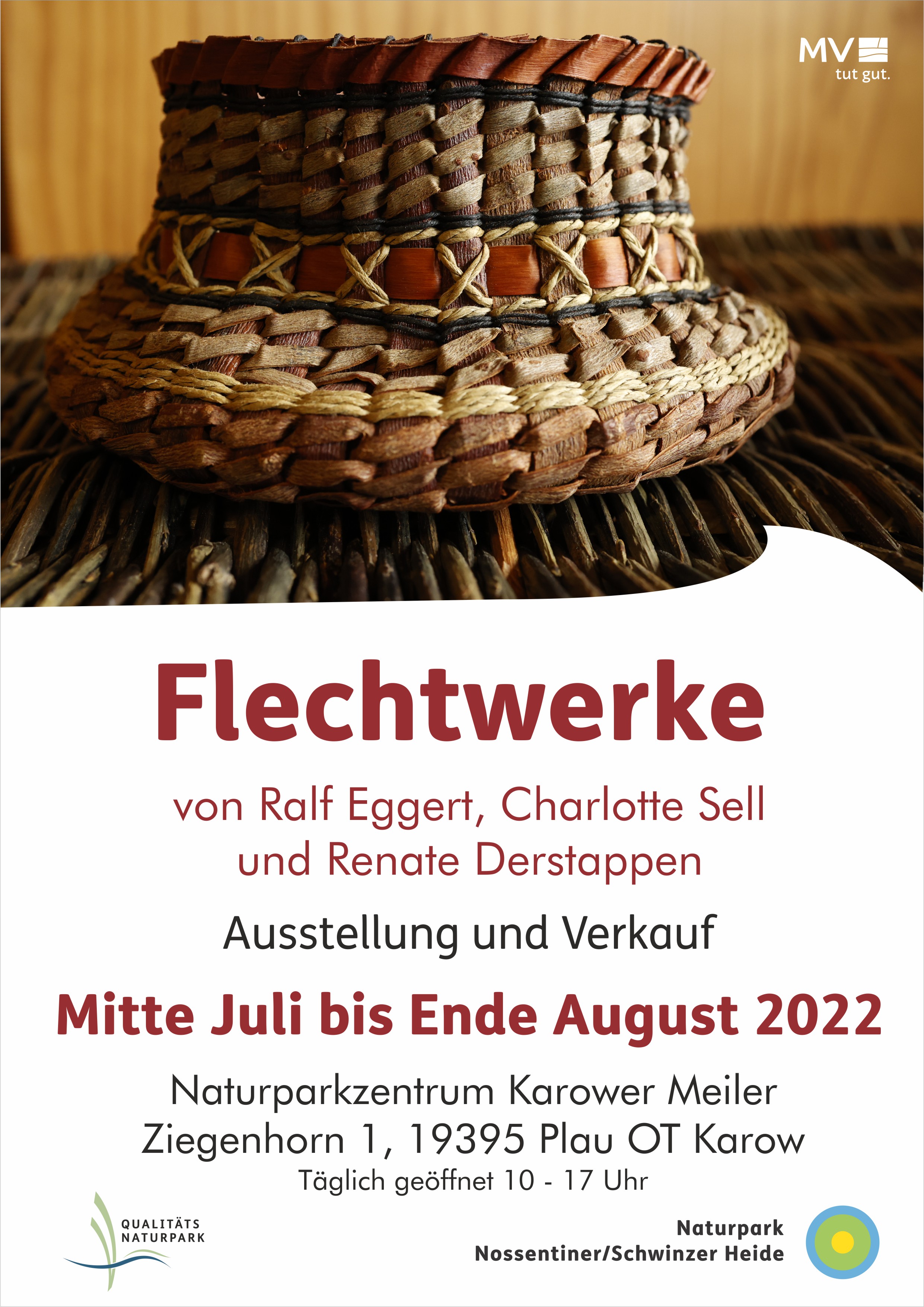 Karow. Es ist wohl eines der ältesten Handwerke der Menschheit: die Korbflechterei. Seit Jahrtausenden nutzen die Menschen diese alte Kunst, um Gefäße, Unterkünfte und Gebrauchsgegenstände für den Alltag zu fertigen. Wasserdichte Körbe wurden in der Steinzeit sogar zum Kochen genutzt. Inzwischen haben Gegenstände aus Kunststoff und Metall diese Funktion übernommen – in Bezug auf Ressourcenverbrauch und Entsorgung durchaus eine bedenkliche Entwicklung. Dass Korbflechterei auch heute noch praktiziert wird und dabei nicht nur Praktisches, sondern auch Schönes entsteht, zeigt die neue Sonderausstellung im Karower Meiler. Die Korbflechter Renate Derstappen (Neu Dragun), Charlotte Sell (Alt Guthendorf) und Ralf Eggert (Woserin) stellen dort einige ihrer Werke aus. Neben Gebrauchskörben finden sich geflochtene Schachteln, Taschen, Lampen und Wanddekorationen. Die Objekte können nicht nur betrachtet, sondern auch erworben werden. Die Ausstellung ist noch bis Ende August im Naturparkzentrum Karower Meiler täglich 10-17 Uhr zu sehen.