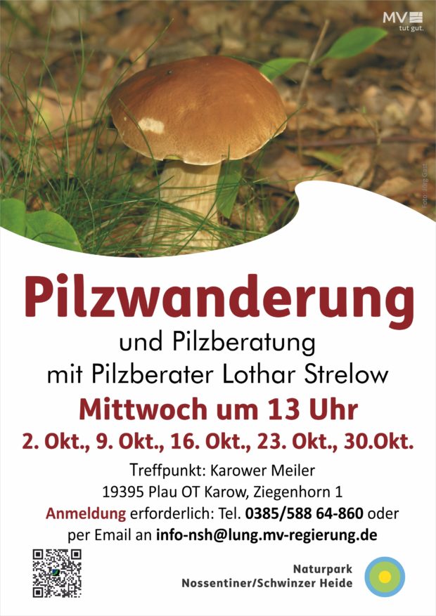 Karow. Endlich gibt es wieder Pilze! Doch welche Pilze sind essbar und von welchen sollte man lieber die Finger lassen? Wer hier dazulernen möchte, hat auf den Pilzwanderungen im Naturpark Nossentiner/Schwinzer Heide im Oktober viele gute Gelegenheiten. Jeden Mittwoch im Oktober bietet der Pilzberater Lothar Strelow seine beliebten Pilzwanderungen an. Treffpunkt ist um 13 Uhr am Karower Meiler. Dort starten die Exkursionen zunächst mit PKW an jeweils günstige Plätze, dann geht es zu Fuß in den Wald. Die Pilzwanderungen sind kostenfrei, um eine Spende wird gebeten. Da die Teilnehmerzahl begrenzt ist, wird um eine Anmeldung gebeten: Tel. 0385/588 64-860 oder per Email an info-nsh@lung.mv-regierung.de.